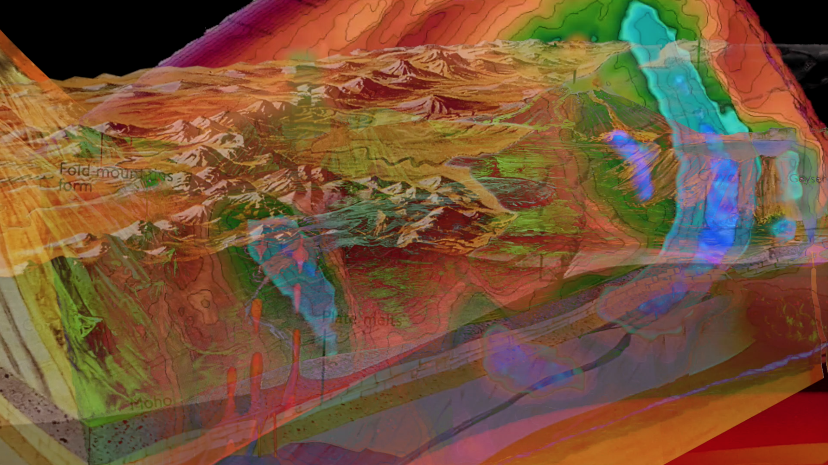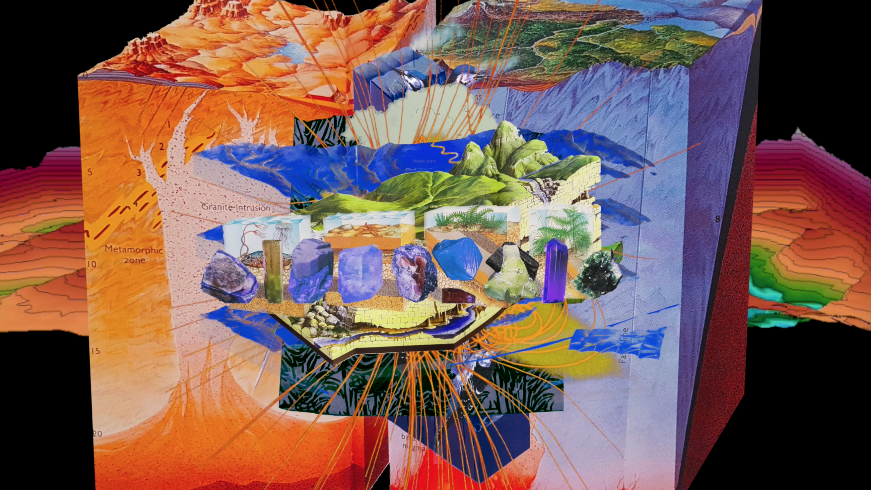 “A Tree Root Tapping on a Concrete Coffin is a new video work... comprising an experimental text linking personal, psychological and philosophical reflections on a series of relationships: organism and environment, foreground and background, time and space and emotional relationships. The video collages spoken text, sound and images carried by visual recordings from an augmented reality sandbox – a geological tool that visualises spatial patterns of environmental data related to topography and mapping. Continuing Kettel’s interests in language, ecology and the mental health of humans, plants and animals, along with their capacities to be emotionally disturbed.”