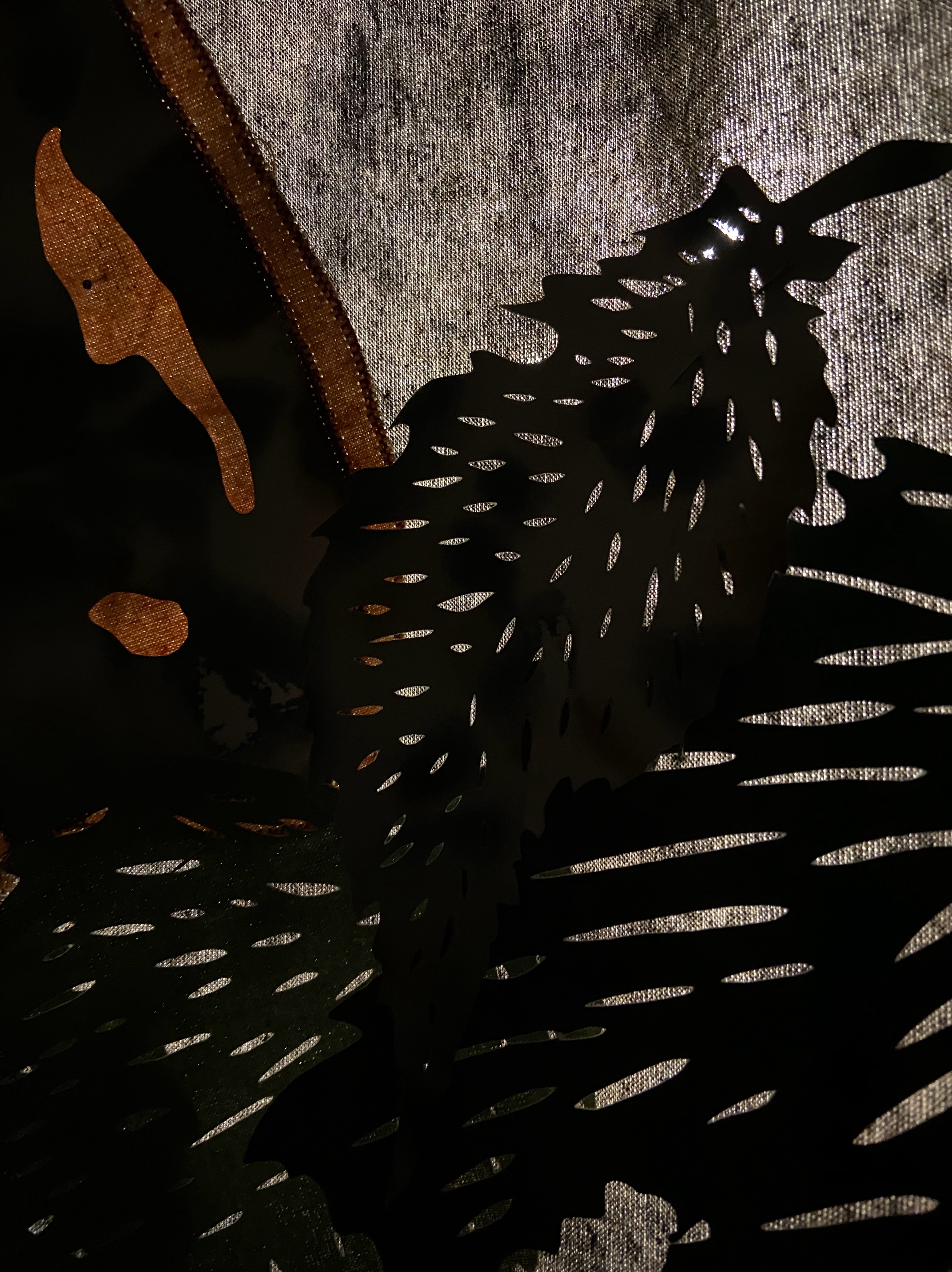 The work exists in three states - the lower, dream and shadow state. The installation physically changes state with programmed lights, lighting the inside and outside of the hanging at intervals, obscuring and revealing details in the work at different points.