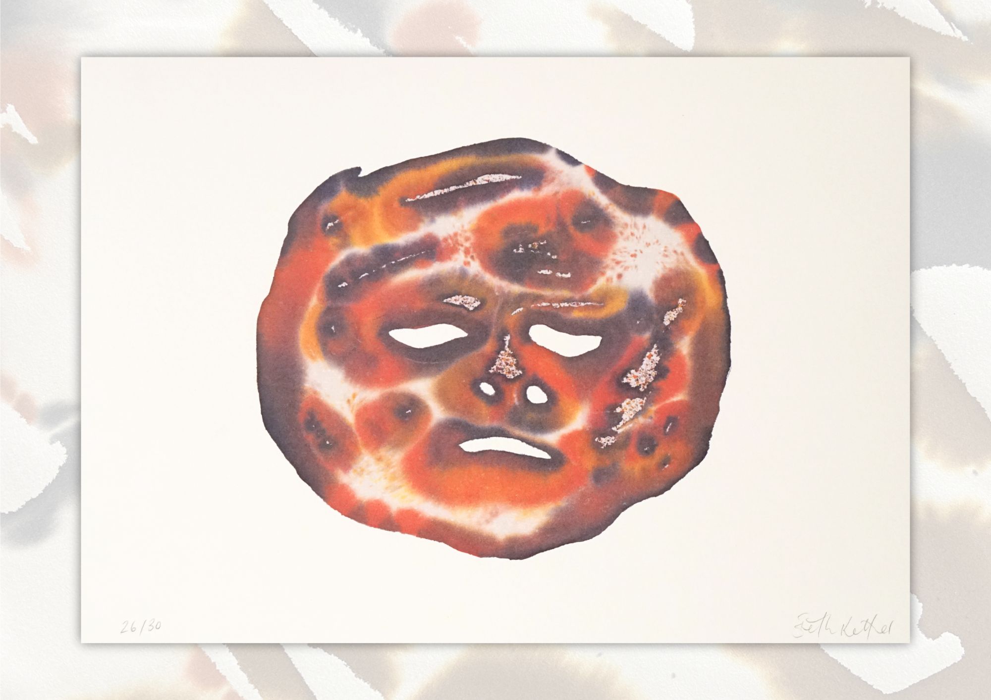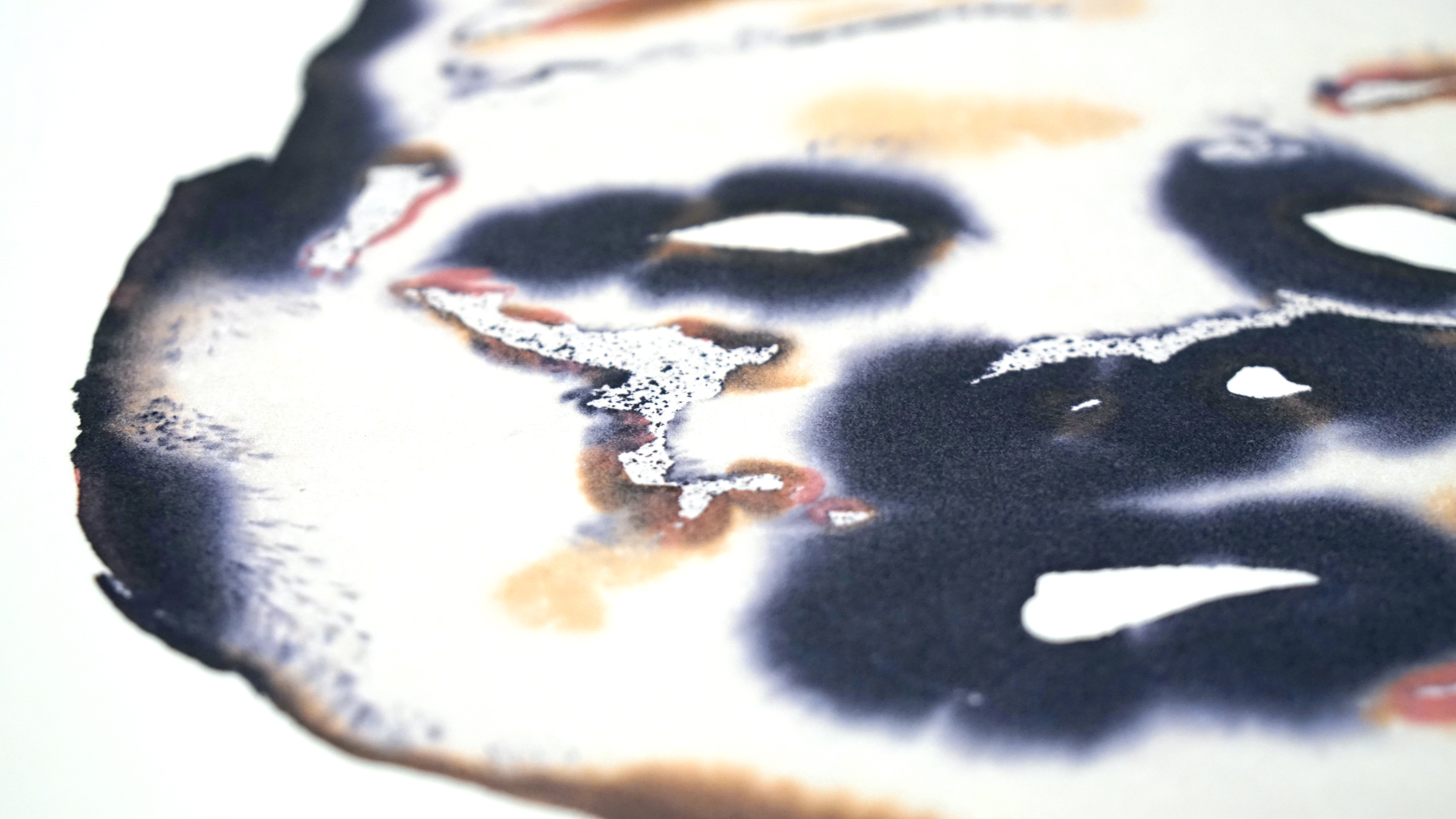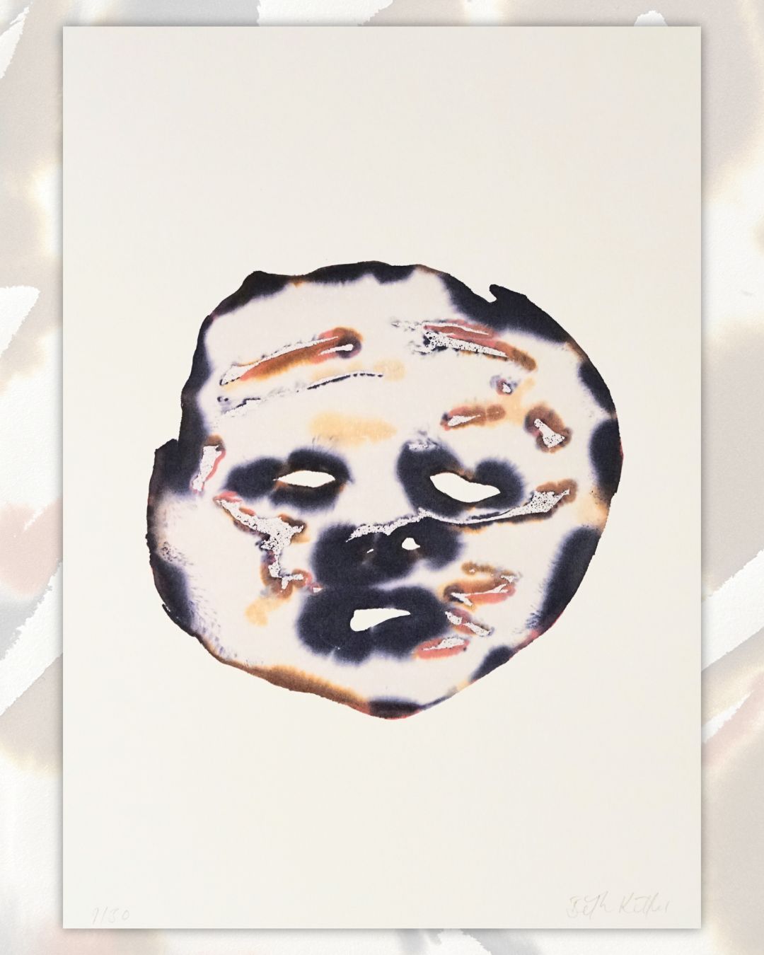These print editions are from a series of ink paintings on fabric produced over the last year. The ink creates the appearance of a delicate creeping effect across the fabric. The series looks at ancient masks and stone statues with weathered, degraded facial features moving clear expression into ambiguity, amidst a wider exploration of how our internal states are translated & distorted externally.