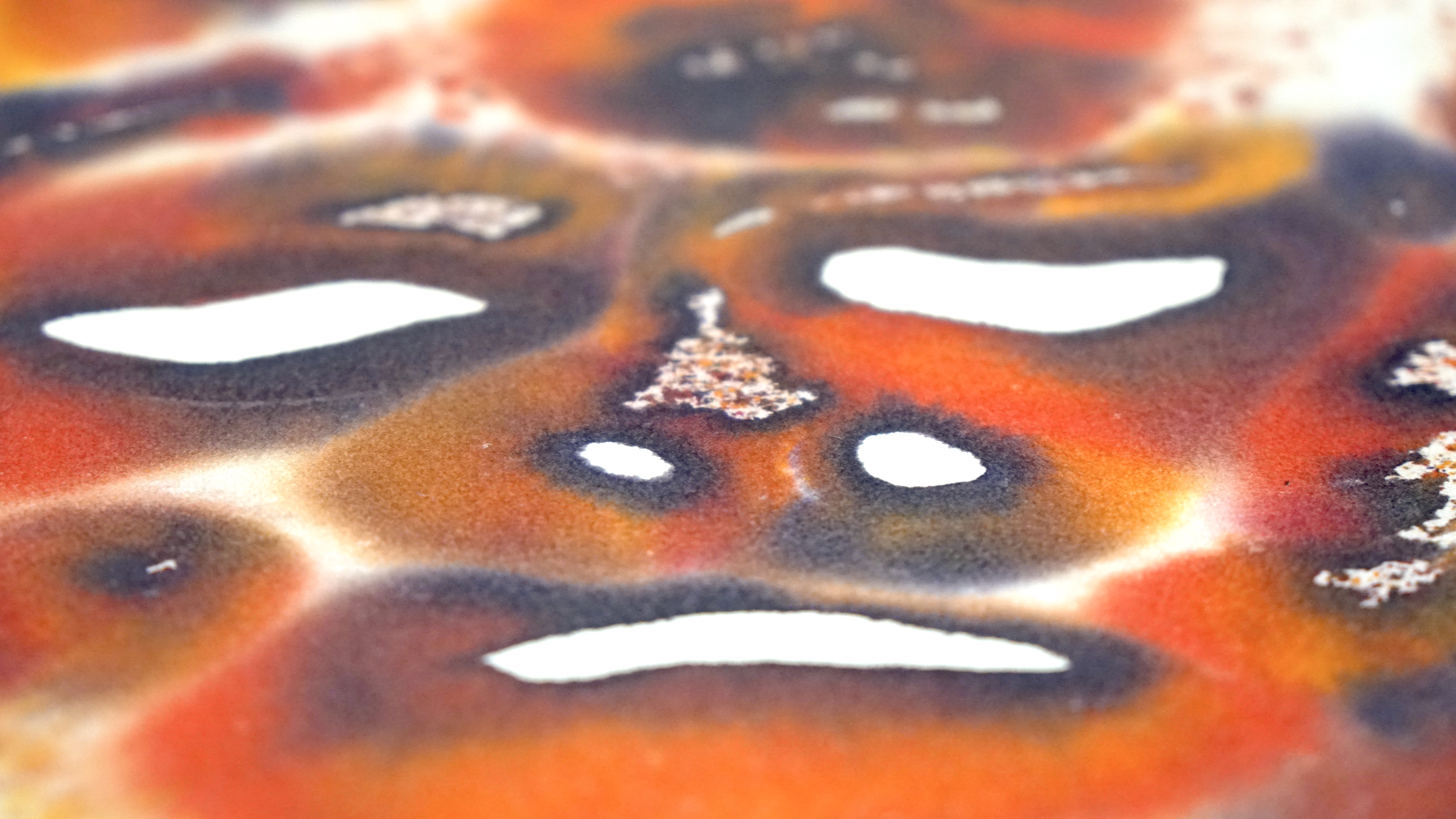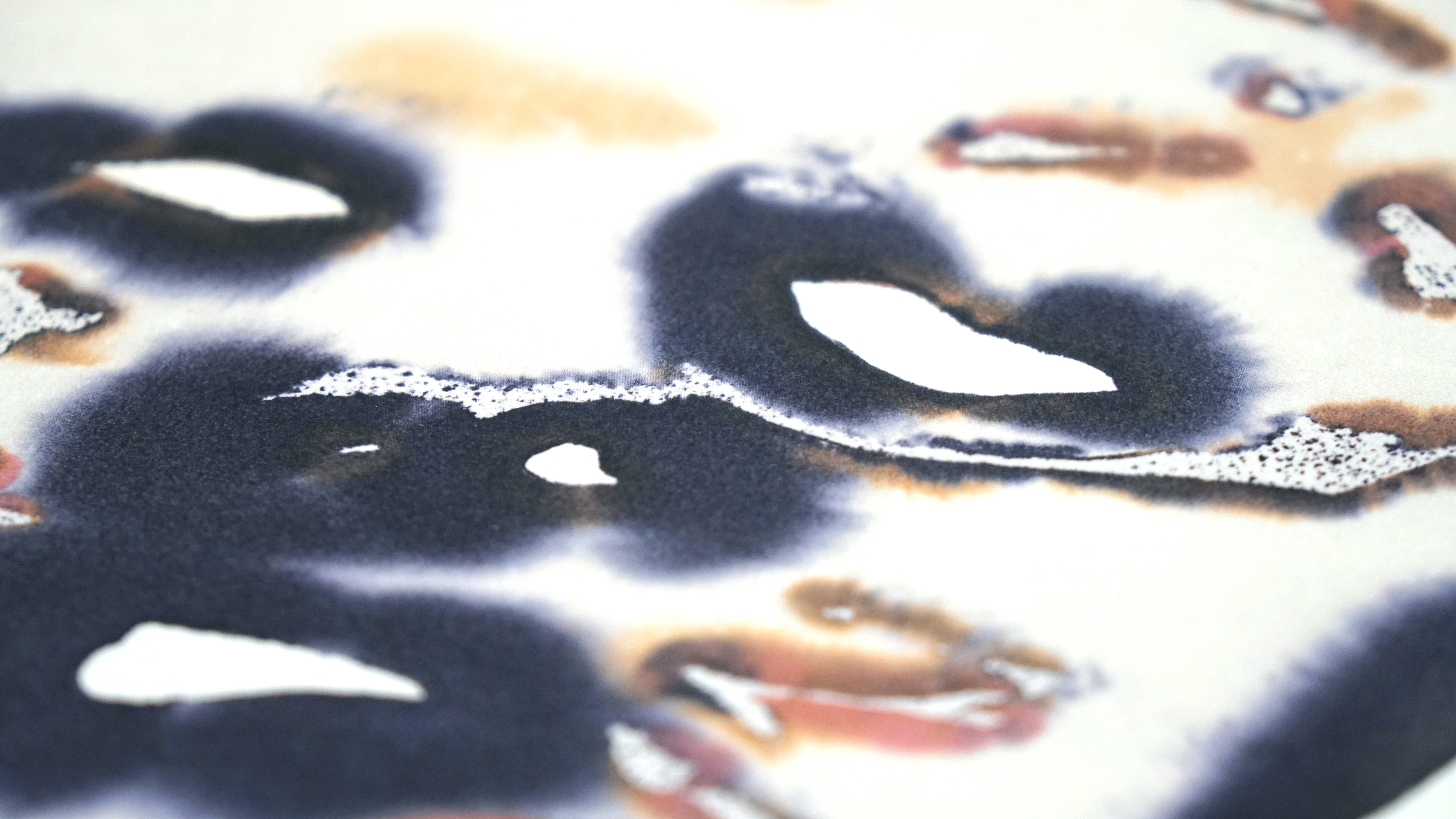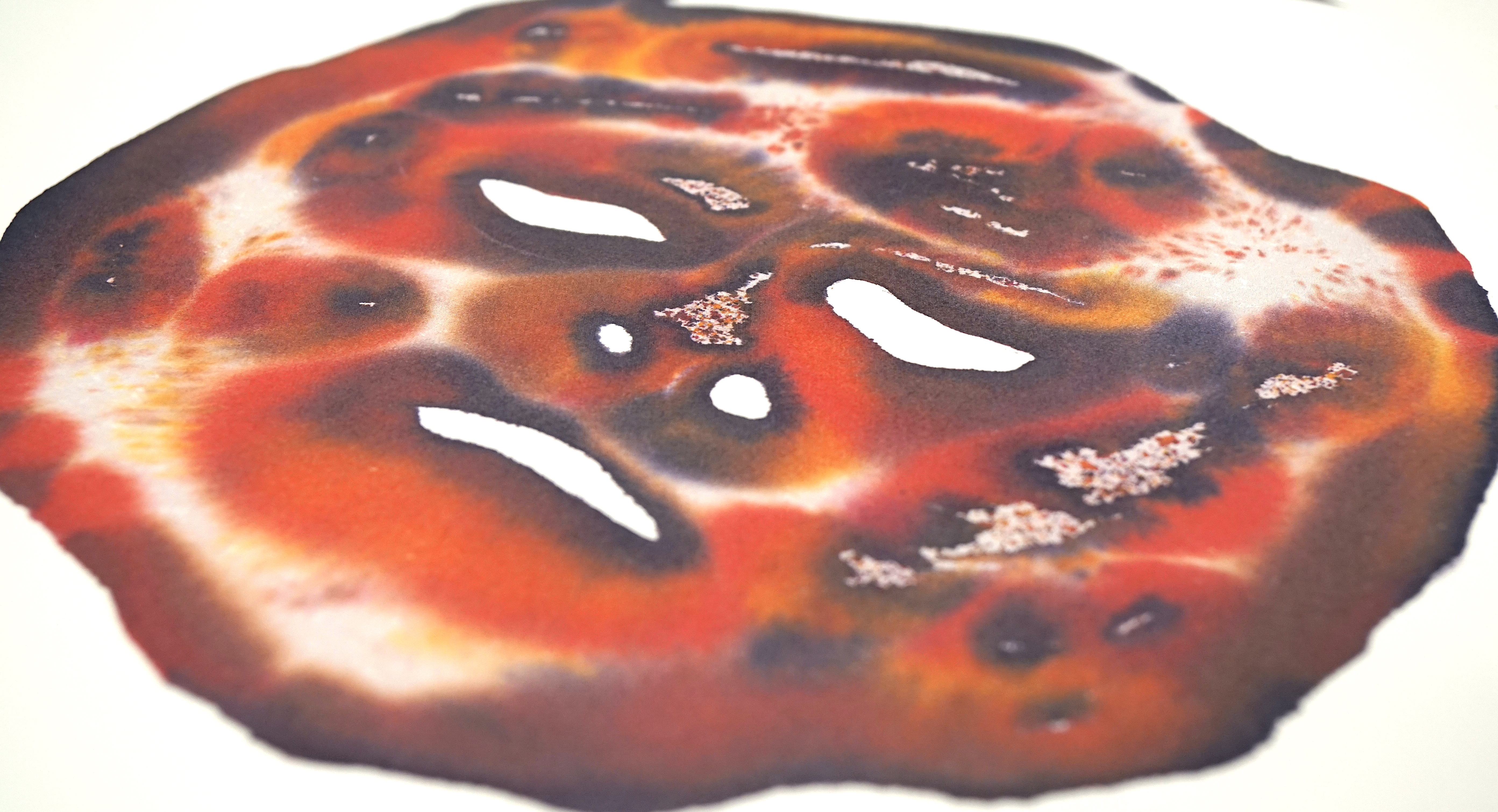 These print editions are from a series of ink paintings on fabric produced over the last year. The ink creates the appearance of a delicate creeping effect across the fabric. The series looks at ancient masks and stone statues with weathered, degraded facial features moving clear expression into ambiguity, amidst a wider exploration of how our internal states are translated & distorted externally.